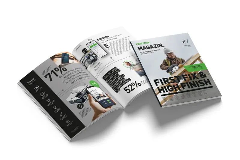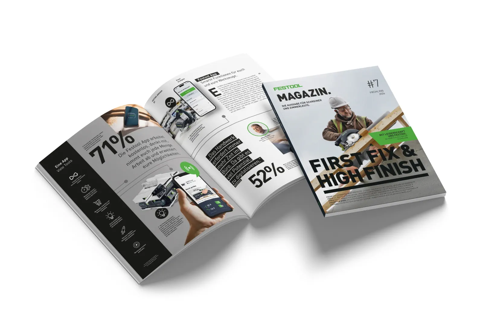 Saumattomat lattiat korkeimmalla tasolla, uudet akkuhiomakoneet valorenkaalla, lisätehoa välilehtivapaiden akkujen ansiosta ja älykkäitä digitaalisia työkaluja jokapäiväiseen työmaatyöskentelyyn: Uudessa maalareille suunnatussa Festool-lehdessä todelliset ammattilaiset näyttävät, miten nykyaikainen käsityötaito toimii nykyään. Lisäksi käytännöllisiä järjestelmäratkaisuja pölyttömään hiontaan, inspiroivia projekteja ja paljon fiksuja uusia työkaluja.
