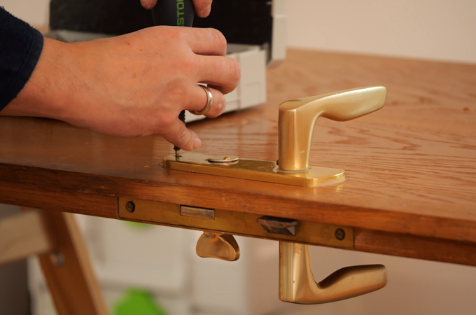 Tämän jälkeen tarkistamme oven sopivuuden. Ripustamalla ovilevyä voimme määrittää, hankautuuko se jostain kohtaa tai työkappalepidetäänkö se avautuessaan ja sulkeutuessaan. Jos näin on, ovi on säädettävä uudelleen. Seuraavaa maalausta varten ovi irrotetaan jälleen saranasta ja irrotetaan helat räikkäsarjalla. Sen jälkeen olemme valmiita seuraavaan vaiheeseen.