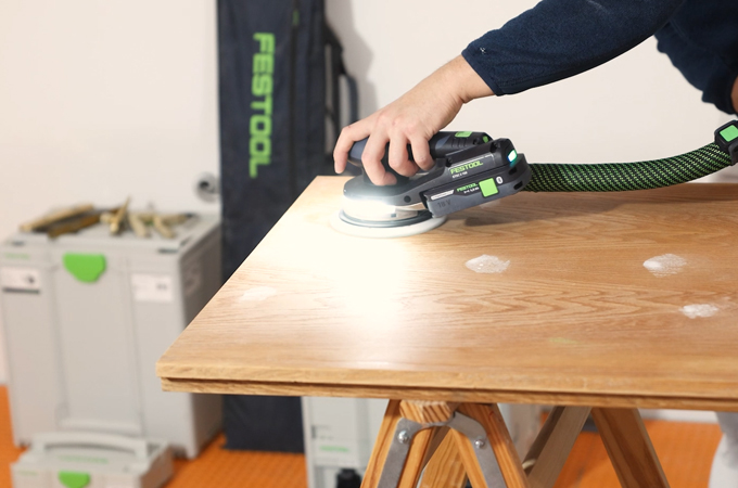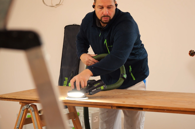 Nyt hiotaan ovi. Käytämme epäkeskohiomakonetta - mieluiten ETSC 2 150 - tasaisen ja laadukkaan pintakäsittelyn aikaansaamiseksi. Suosittelemme hiomapaperin hiomana Granat-yleishiomapaperia, jonka karkeus on P180. Näin varmistetaan, että ovilehden molemmat puolet hiotaan tasaisesti. Integroidun valon ansiosta oven pinnan epätasaisuudet tai vauriot voidaan tunnistaa suoraan ja merkitä tarvittaessa Tappilla.