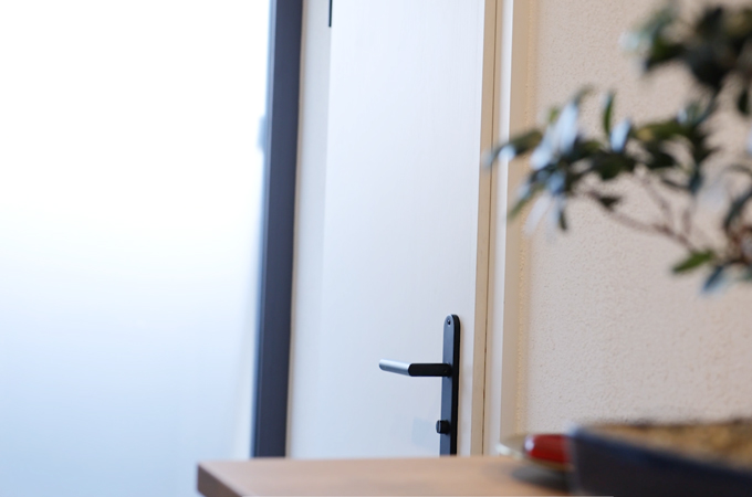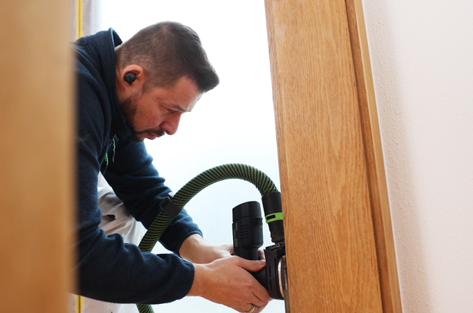 Ensimmäinen vaihe on tarkistaa ovi. Onko siinä näkyviä vaurioita tai hankaako ovi lattiaa vasten? Jos ongelmia ilmenee, suosittelemme oven säätämistä lattian korkeudelle. Lattian korkeus muuttuu usein remontin aikana - joko lattialämmityksen tai uuden lattiapäällysteen vuoksi. Mittaamme siksi uuden korkeuden oven saranoiden kohdalta ja lyhennämme ovilehden oikealle korkeudelle Upotussahalla ja Ohjainkiskolla.