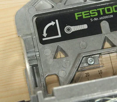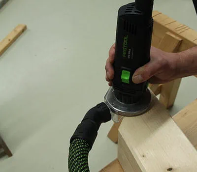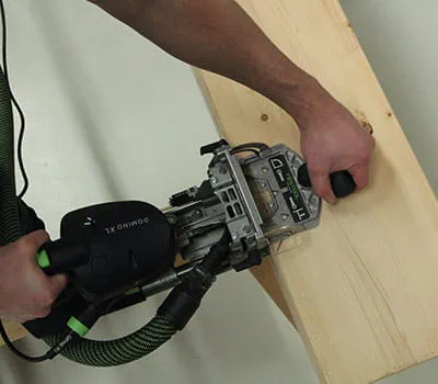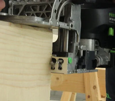 Aseta DOMINO XL puupylvään kiinnityskohdan merkinnän kohdalle ja jyrsi ensimmäinen reikä. Jyrsi sitten toinen reikä ja varmista tässä yhteydessä, että rajoitintappi (keskimmäinen) on taas ensimmäisessä reiässä.
