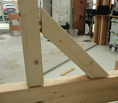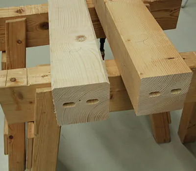Käyttämällä lamellotappeja rakennuspuiden tarkkaan kohdistamiseen saat liitettyä yläpalkin nopeasti ja helposti puupylväisiin.