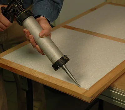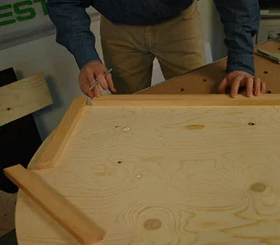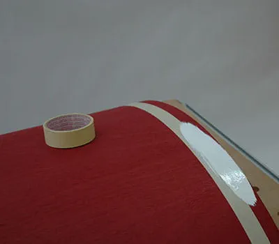 Myöhemmin tehtävän tarkan sijoittamisen helpottamiseksi on tärkeää merkitä katon ulkonema. Liimaamiseen käytämme jälleen PU-liimaa. Tässä työvaiheessa tulee työskennellä apurin kanssa. On myös suositeltavaa kokeilla koko asennus etukäteen osat ”kuivina” (ilman liimaa). Levitä liimaa kattotukiin ja kiinnitä verhous yhteen ulkoreunaan.