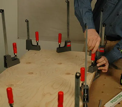 Paina alusrakenne verhouksen päälle ja kiinnitä se puristimilla ensin keskeltä ja sitten toisen päätylistan kohdalta. Hyvän tuloksen saavuttamiseksi kiinnitetään mahdollisimman monta puristinta. Jos kuivumisen jälkeen on vielä rakoja, tiivistä ne katon sisäpuolelta silikonilla.