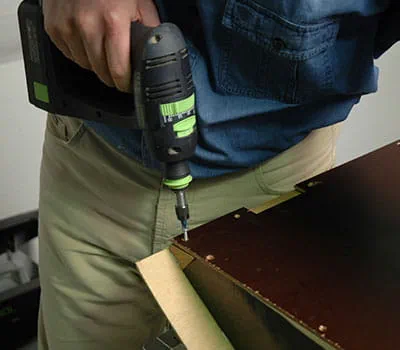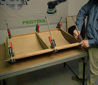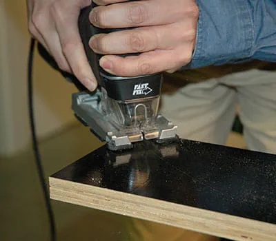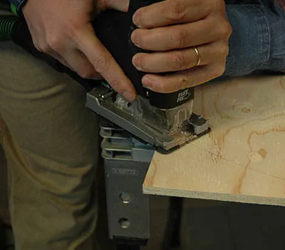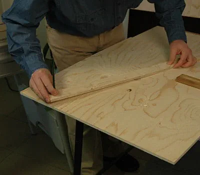 Leikkaa vanerilevyt materiaaliluettelossa annettujen tietojen mukaan. Jos haluat leikata yksittäiset levyt itse, se onnistuu helpoiten, kun asetat aluspuut lattialle ja leikkaat sitten levyt upotussahan ja ohjainkiskon avulla. Kokemus on osoittanut, että projekti kannattaa aloittaa kahden sivuseinän ja
