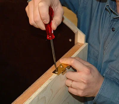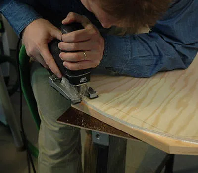 Nyt kun katto on paikallaan ja kohdistettu, merkitse saranoiden sijainti. Merkitse saranoiden alla oleva seinän ulkopuoli pistopuikolla. Ota katto taas pois ja ruuvaa saranat kiinni. Nyt koko koppi voidaan koota, minkä jälkeen kaikki reunat ja kulmat hiotaan. Pura koppi uudelleen ja hio kaikki ulkopinnat epäkeskohiomakoneella.