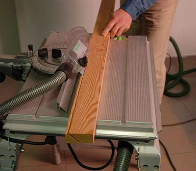 Aseta pistosahan heiluriliike asentoon 1 saadaksesi tarkan sahausreunan. Leikkaa pöytäsahalla kattopäätylistat pituussuunnassa viistoiksi. Massiivipuun pituusleikkauksessa tulee ehdottomasti käyttää karkeaa sahanterää. Katkaise rimat pöytäsahalla oikean pituisiksi.