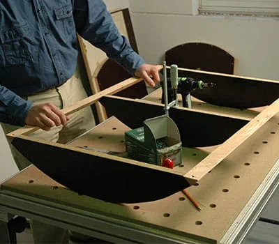 Purista kaksi päätyosaa yhteen ja hio yläpohja karkealla hiekkapaperilla. Jos sinulla on kopiointirenkaalla varustettu yläjyrsin, voit myös jyrsiä päätyseinien pyöristykset. Merkitse alusrakenteen paikat (kohdat 10, 11) päätypuoliin.