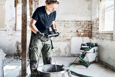Vispiläkone on tärkeä työkalu jokaisella rakennustyömaalla. Olipa kyse sitten maaleista, muuraus-, laattakiinnitys- tai rappauslaasteista, tasoitteista tai pakkelimassoista – ammattiluokan vispiläkoneella jopa sitkeäjuoksuiset materiaalit voi sekoittaa helposti ja luotettavasti. 2-portaisen vaihteiston, kierrosnopeuden säätötoiminnon ja kestävän, sitkeästi vetävän sähkömoottorin ansiosta sekoitusnopeuden voi säätää optimaalisesti jokaisen materiaalin mukaan. Vielä yksi lisäetu: kätevä ErgoFix-korkeudensäätö varmistaa, että Festool-vispiläkoneita voi käyttää ergonomisesti selkä suorana.